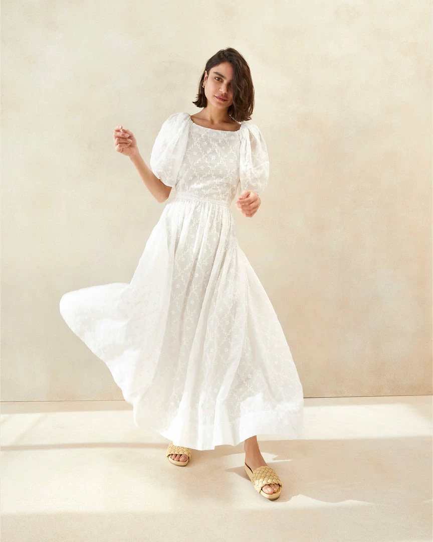 Smocked tiered dress in cream vine floral cotton voile. Features a square neck and elasticated straps. One of Jessie’s favorite materials for its light weight and ability to take color, our cotton voile is sourced in Italy.