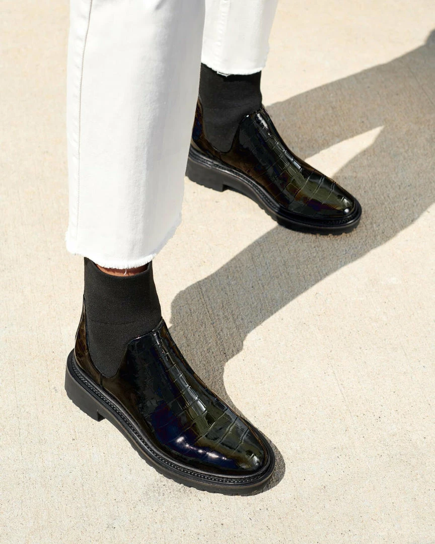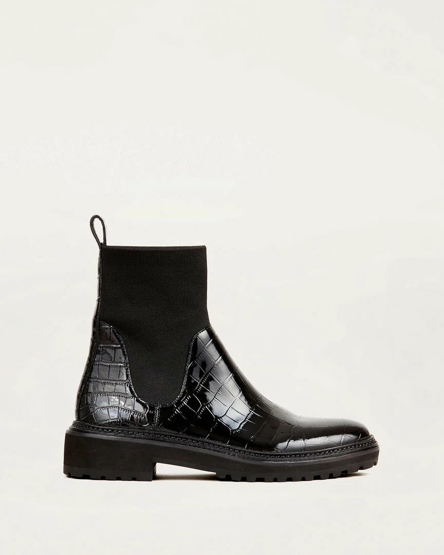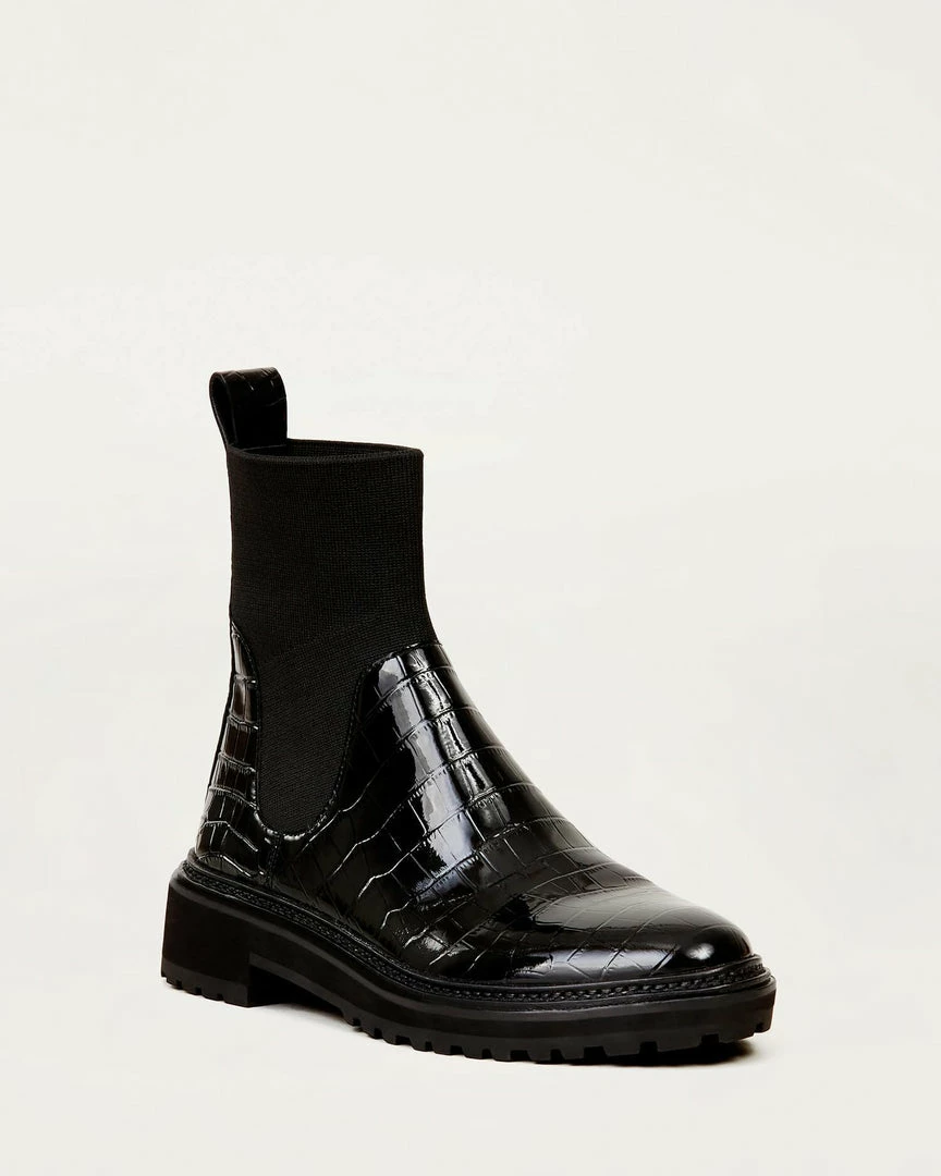 Lug sole bootie with stretch knit ankle in patent black croc-embossed leather. Round toe, pulls on.