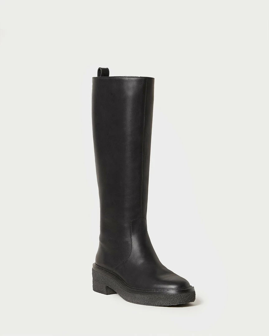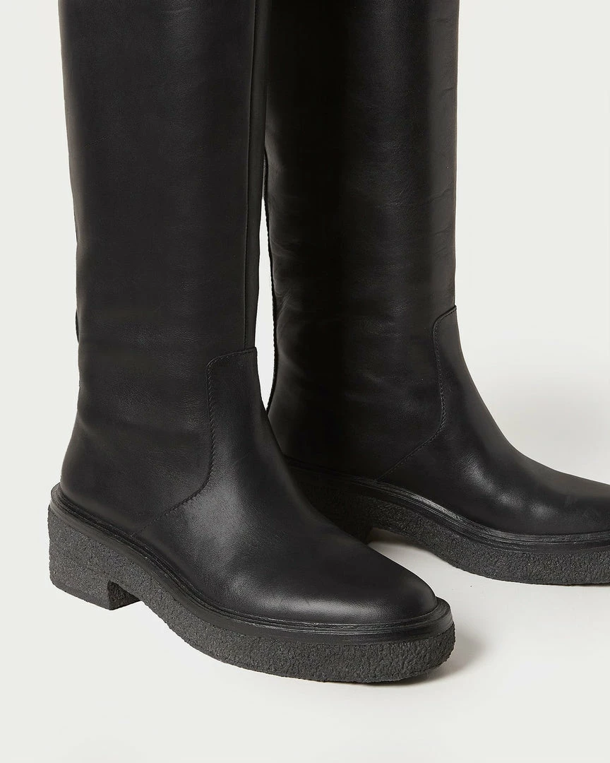 Straight shaft tall boot with crepe rubber sole in black leather. Padded footbed with gold stamped logo. Round toe, pulls on with a pull tab. 1.75 inch heel.