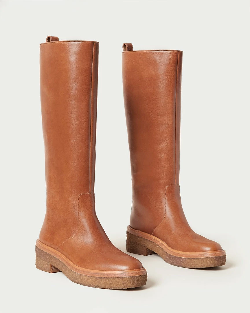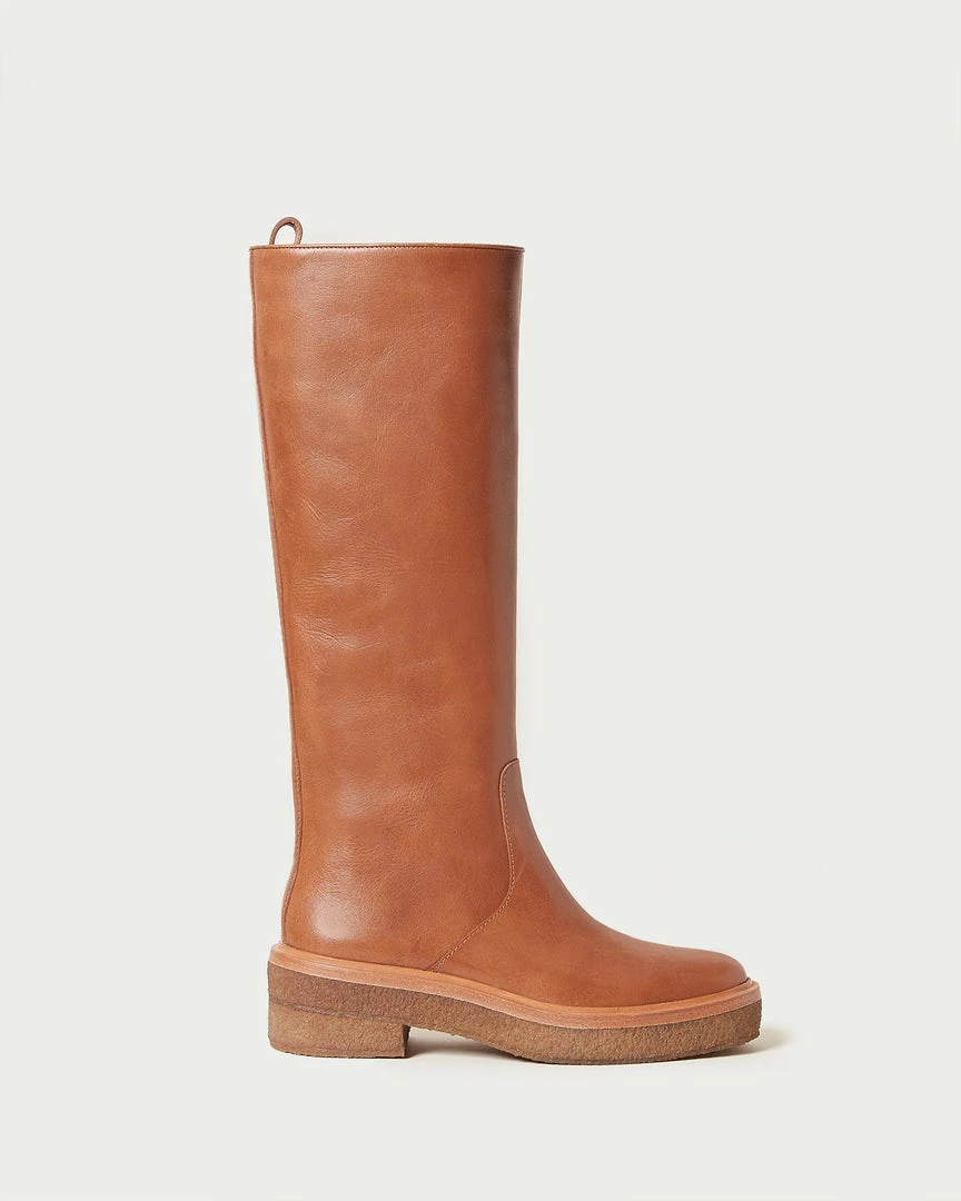 Straight shaft tall boot with crepe rubber sole in safari beige vegetable-tanned Italian vachetta leather. Padded footbed with gold stamped logo. Round toe, pulls on with a pull tab. 1.75 inch heel.