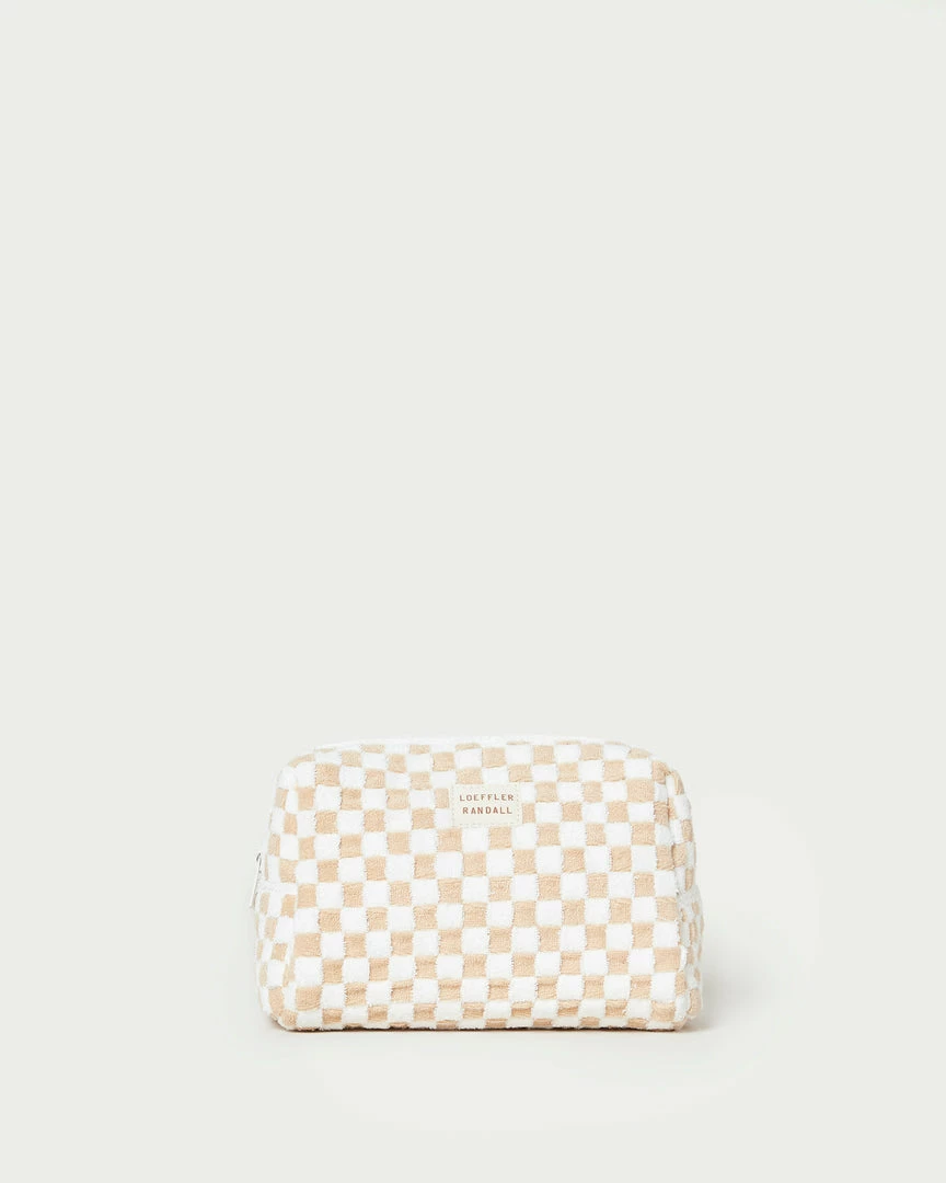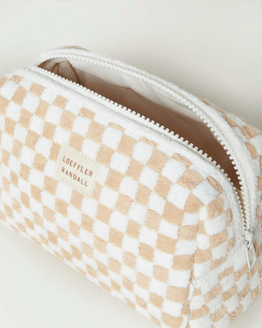 Cosmetic pouch in camel and cream gingham print terrycloth. Features the LR sport logo and a zipper closure.