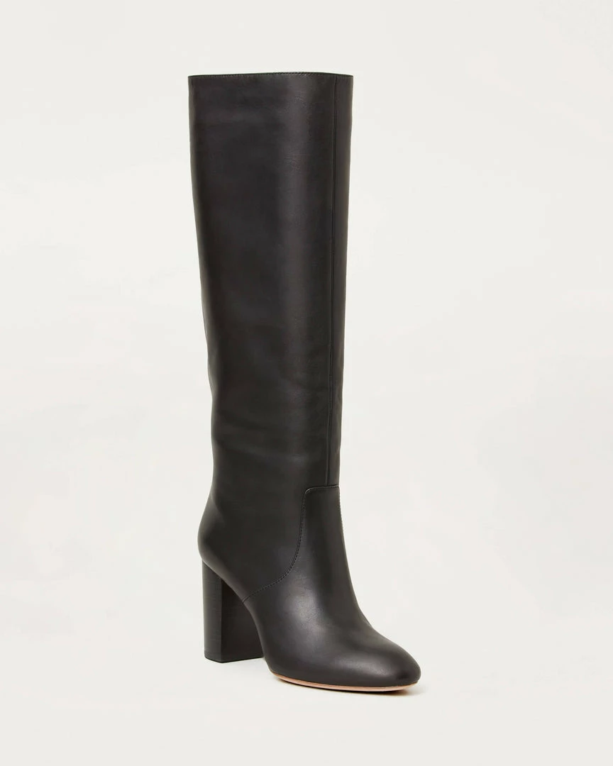 Tall shaft boot with high heel in black soft calf leather. Padded footbed with gold stamped logo. Almond toe, pulls on. 3.5 inch heel.