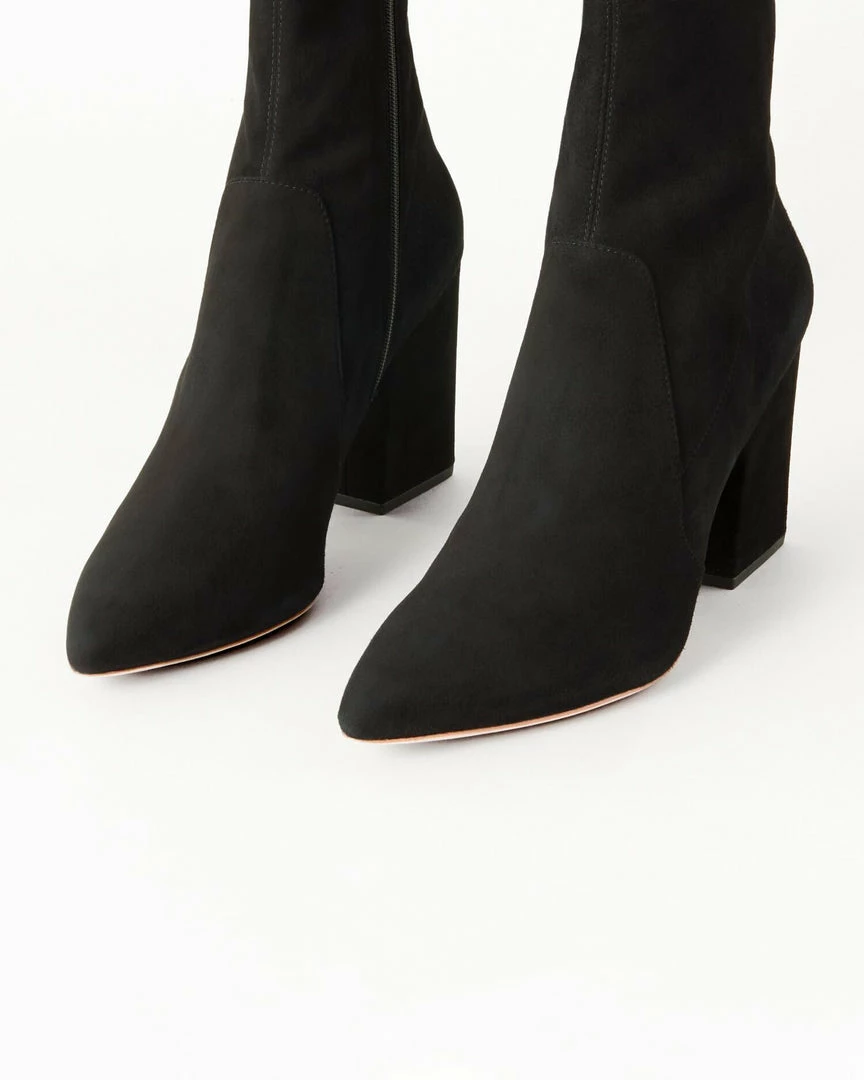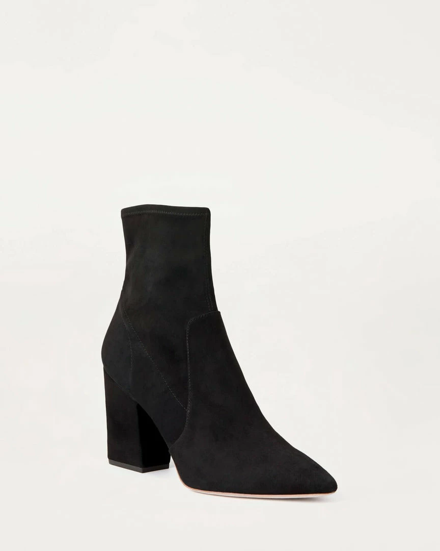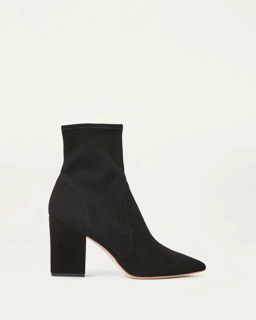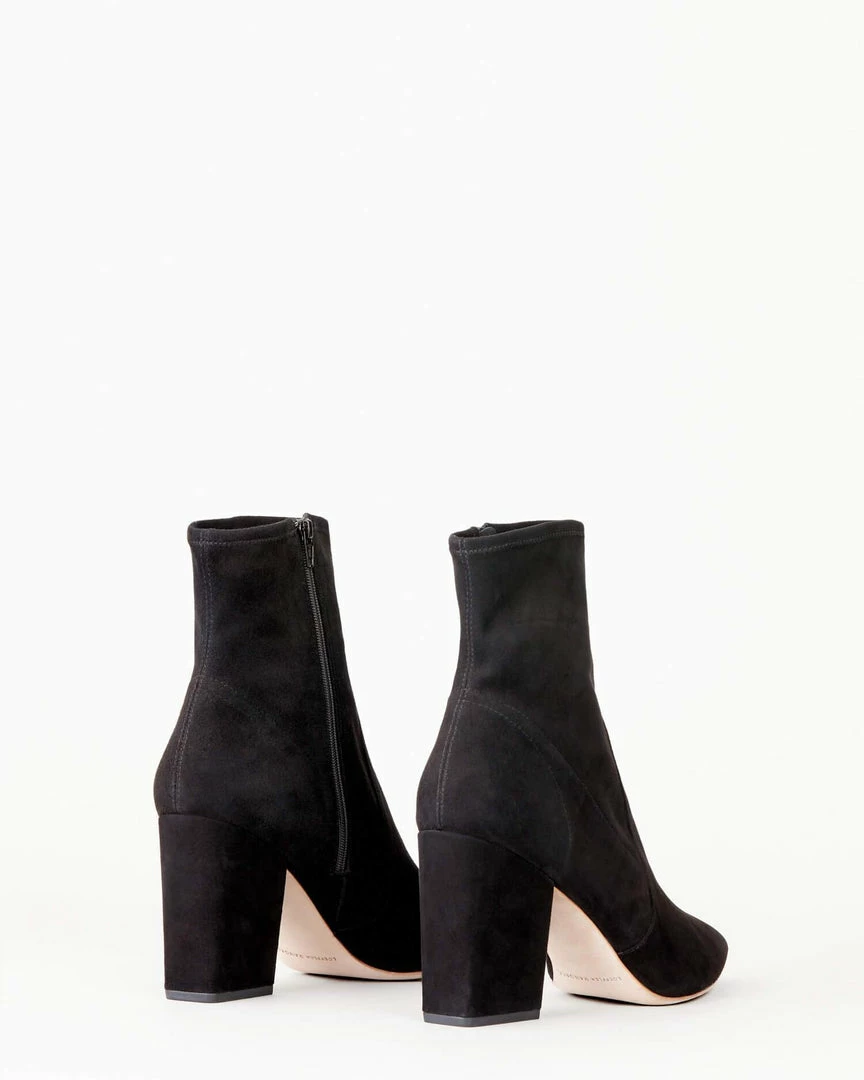 High heel ankle bootie with pointed toe in black stretch suede. Padded footbed with gold stamped logo. Side zipper. 3.5 inch heel.