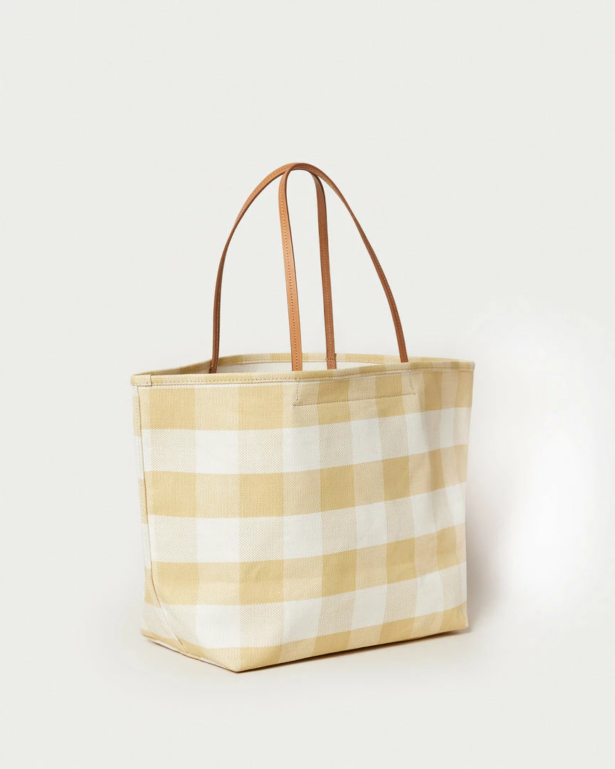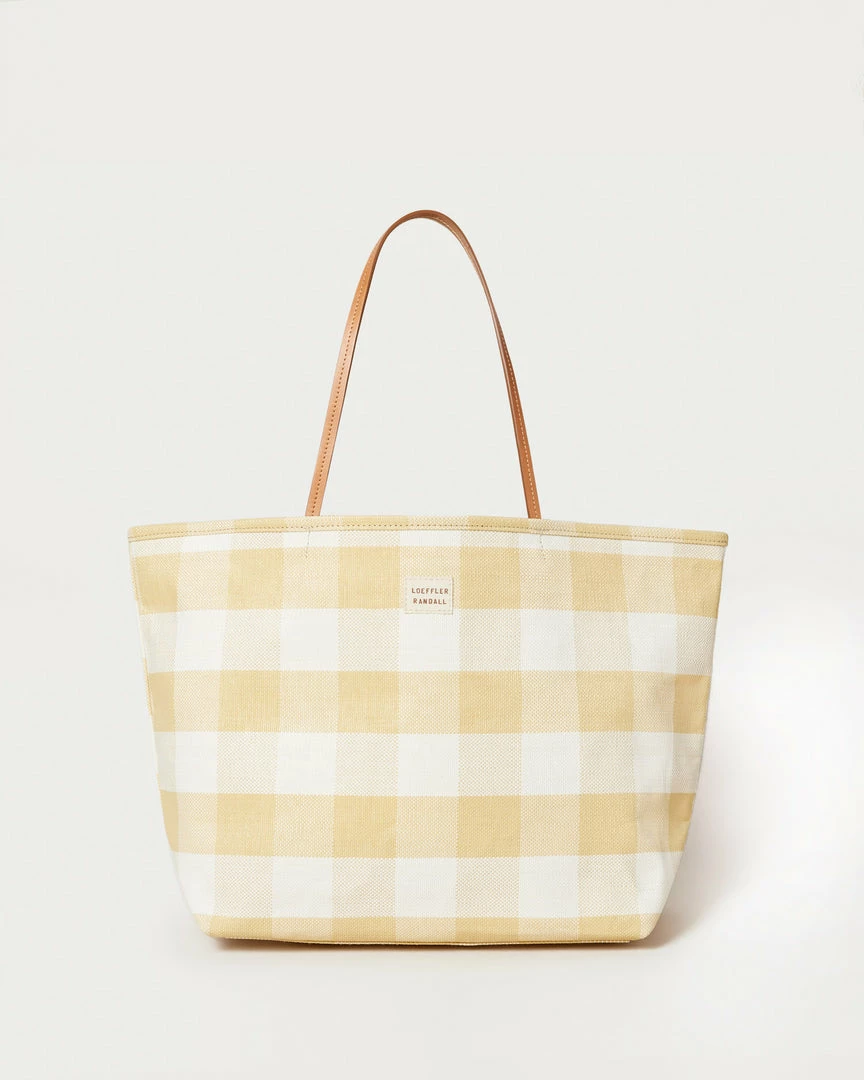 East-West tote bag in hay pale yellow and cream-colored gingham woven plastic. Features leather top handle straps and an interior pocket.