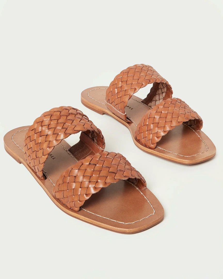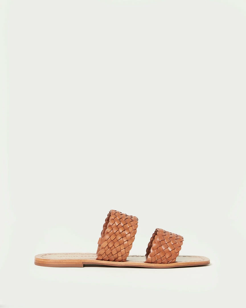 Flat slide sandal with a double woven leather strap upper in timber brown leather. Features a tonal stamped logo, contrast stitching, and an open, square toe. Slips on.Â