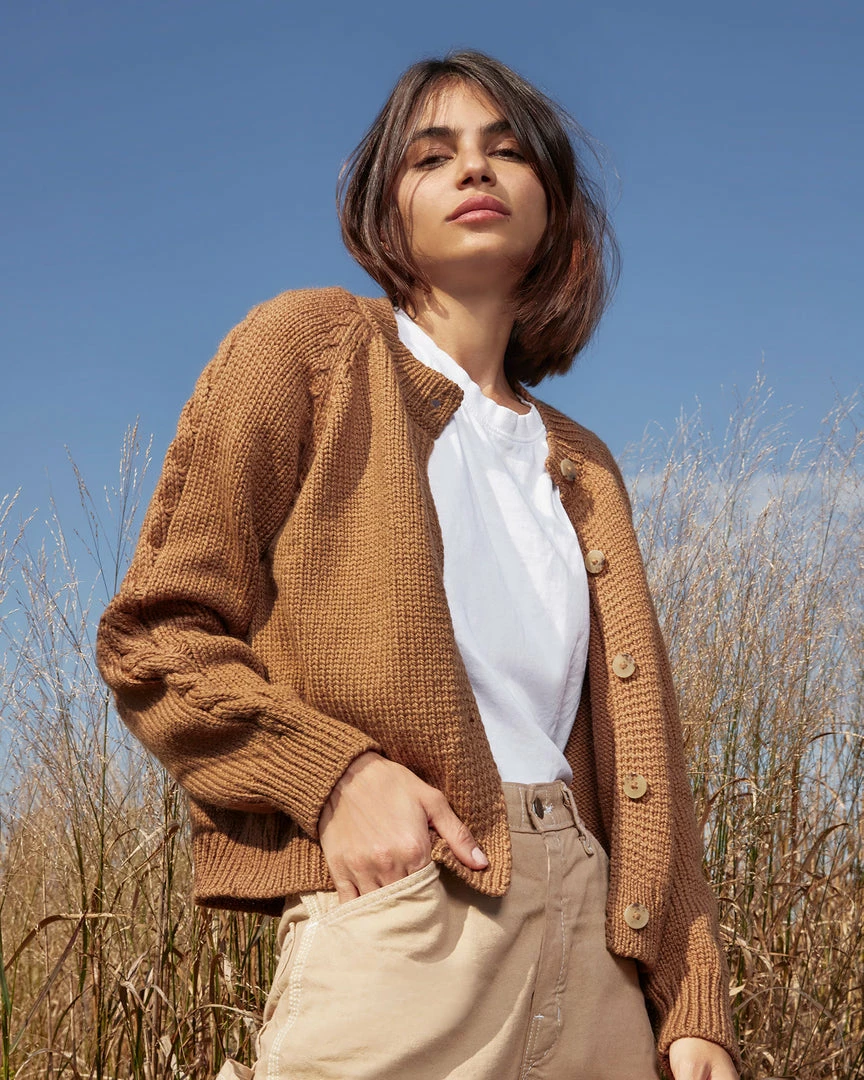 Cropped crewneck caridgan with cable knit detailing on sleeves and tortoiseshell buttons in nutmeg colored brown wool. This sweater is 100% Andean Highland wool made in Peru by a collective of knitters whose work provides support to women and children living in poverty on an island called Amantani on Lake Titicaca.
