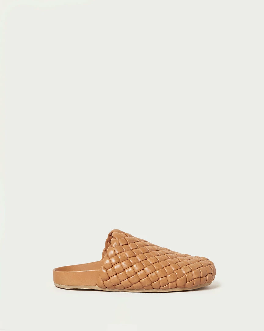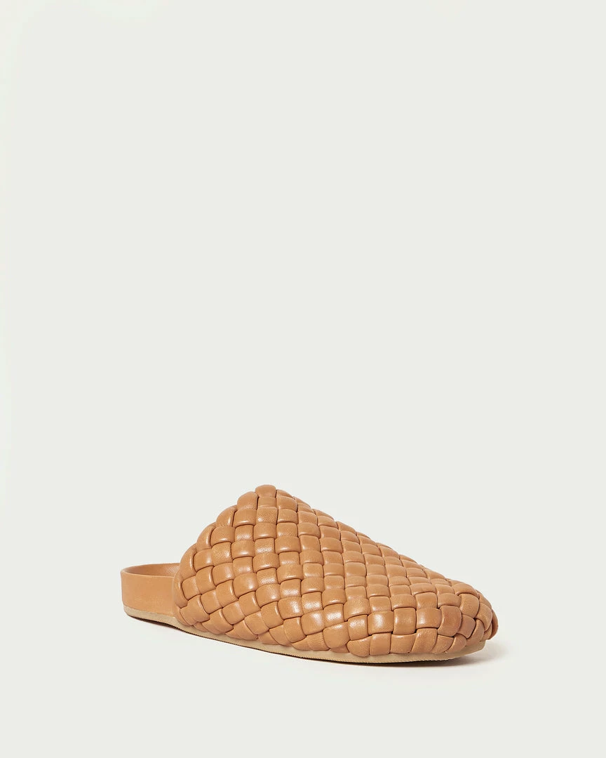 Woven leather backless footbed sandal in beige-brown leather. Features a padded footbed with gold stamped logo. Round toe, slips on.