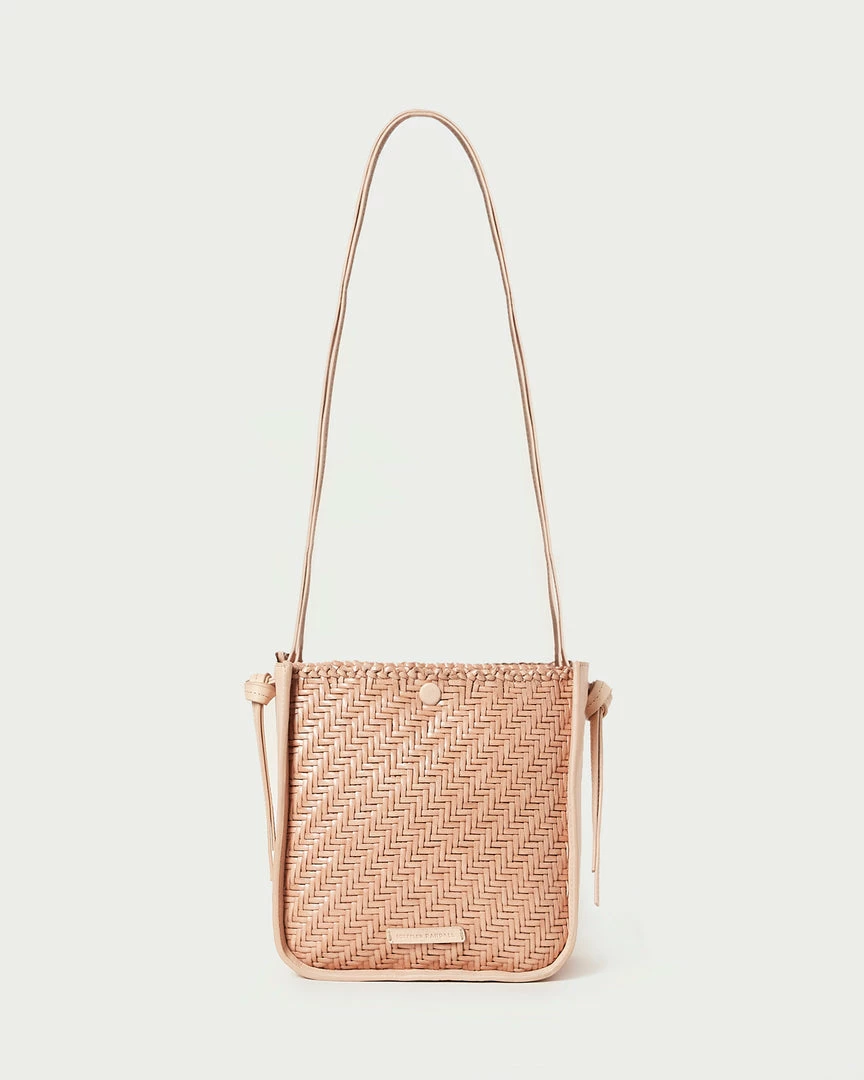Turned out crossbody tote in natural light beige woven leather. Features a crossbody strap, snap closure, full lining, and a large interior slip pocket.