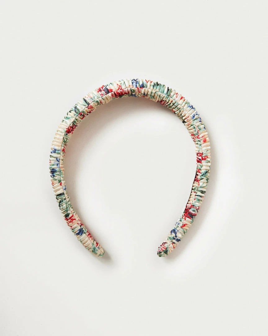 Puffy headband in tan vine floral pleated fabric.