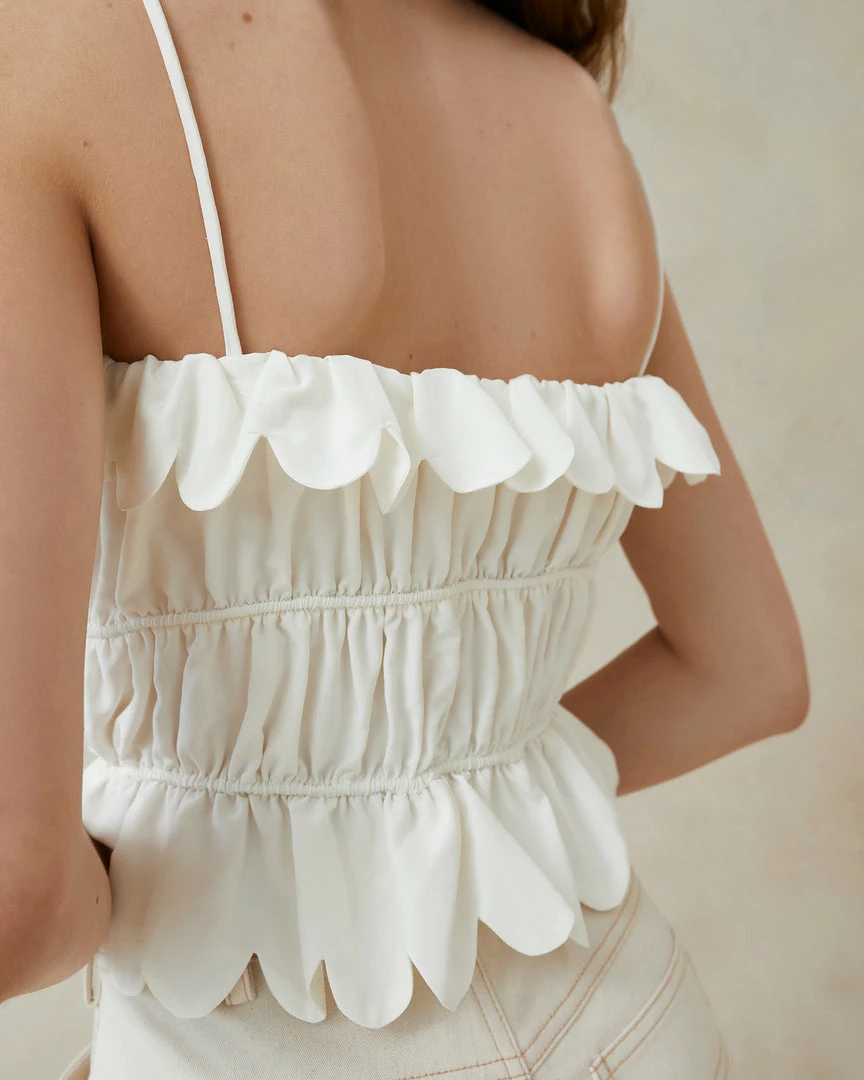 Sleeveless gathered bodice top in a cream silk and cotton blend featuring scalloped detailing along the bust and hem.