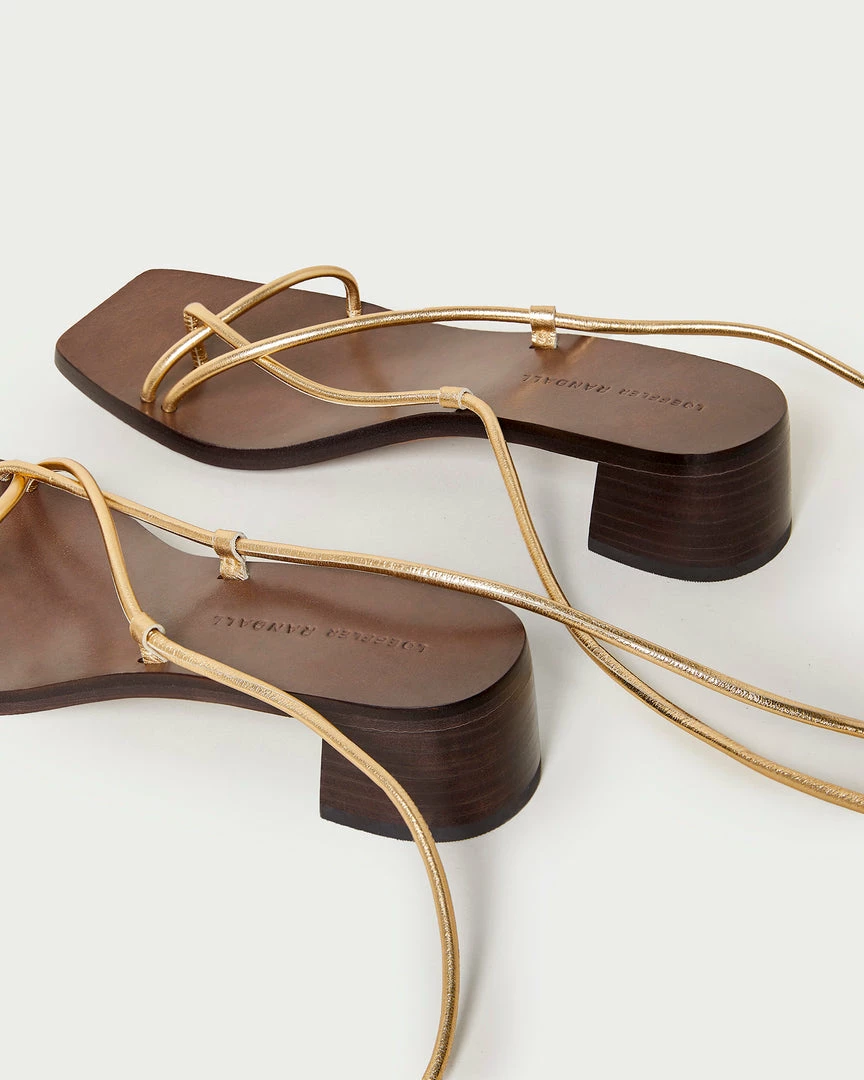 Strappy wrap sandal on a low heel in metallic gold Italian nappa leather. Features a plank footbed, an open, squared toe, and wrap tie closure. 1.5 inch heel.