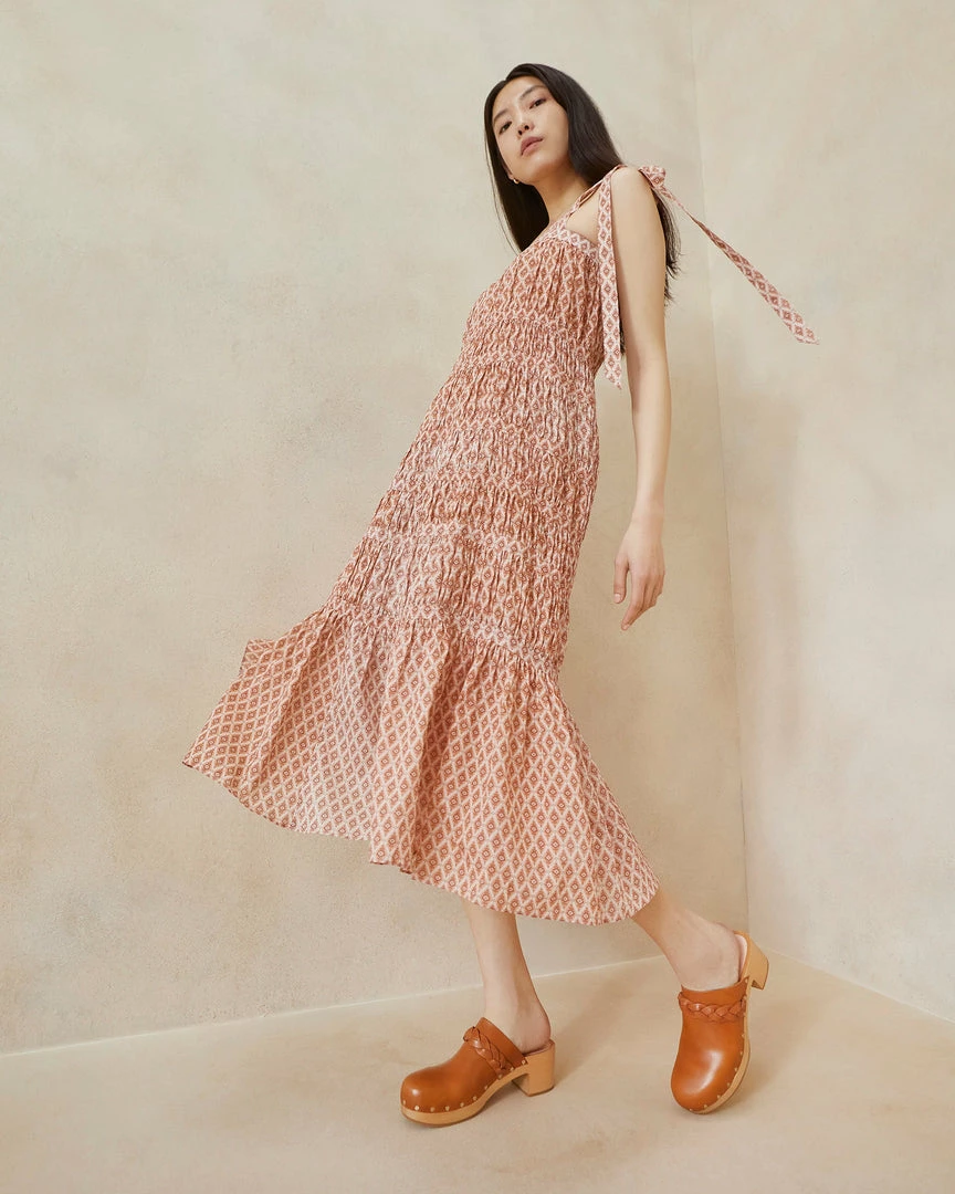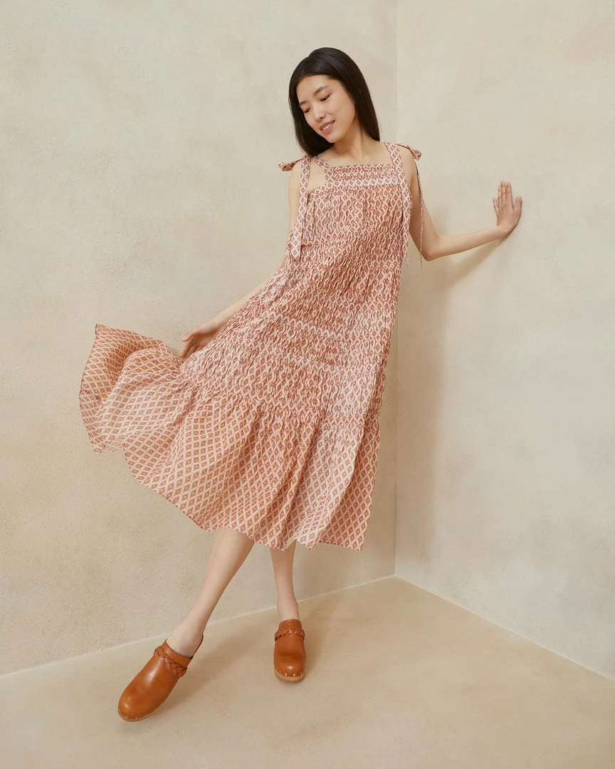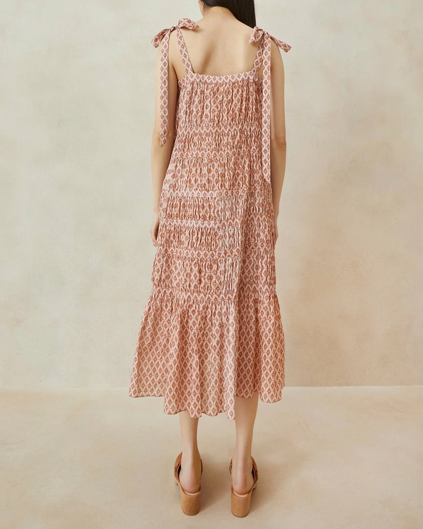 Mid-length pleated tent dress in tan diamond floral cotton voile. Features a square neckline and thin straps with trailing bows.