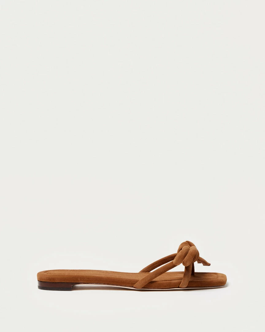 Flat slide sandal with knotted bow detail in cacao brown suede. Features a padded footbed with gold stamped logo, tonal stitching, and an open, square toe. Slips on.