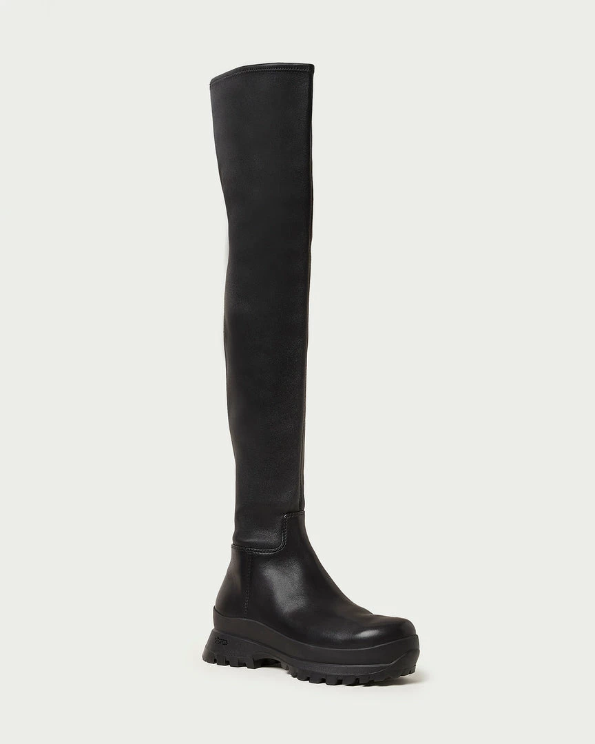 Over-the-knee lug sole boot in black stretch leather. Features a padded footbed with gold stamped logo, round toe, and a Vibram® outsole, which is engineered for quality and comfort with traction optimized for unstable terrain. Pulls on. 3 inch heel.