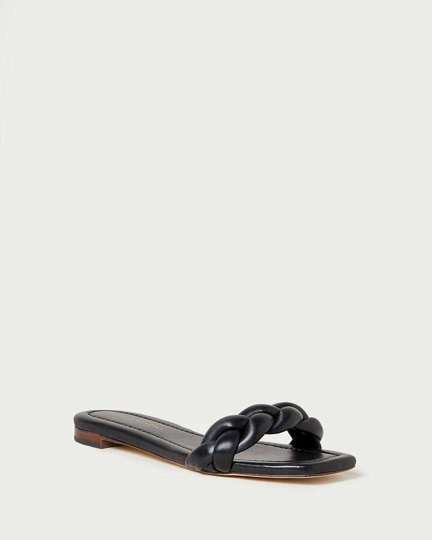 Flat sandal in black nappa leather with braided band detailing. Features a padded footbed and an open, squared toe. Slips on.