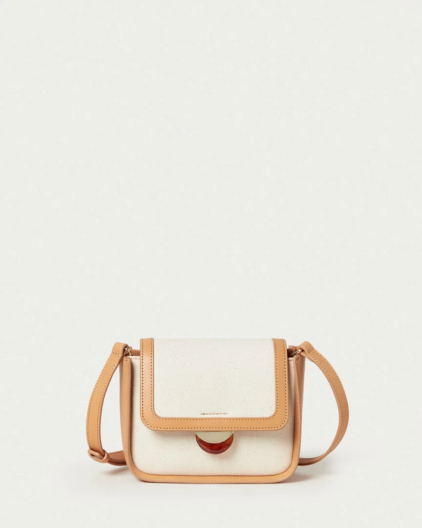 Crossbody bag in natural canvas fabric with honey beige Italian vachetta leather trim. Features a vachetta leather crossbody strap, a resin and metal magnetic closure, suede lining, and an inside pocket.