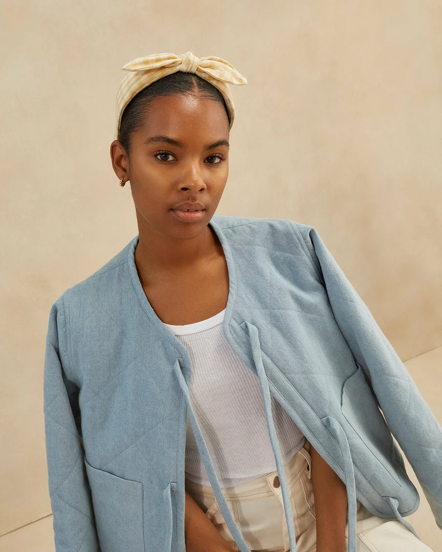 Wide knotted bow headband in pale yellow and cream gingham canvas fabric.