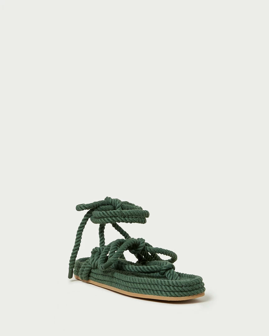 Strappy flat thong sandal in dark green rope. Features an open toe and ankle wrap closure.