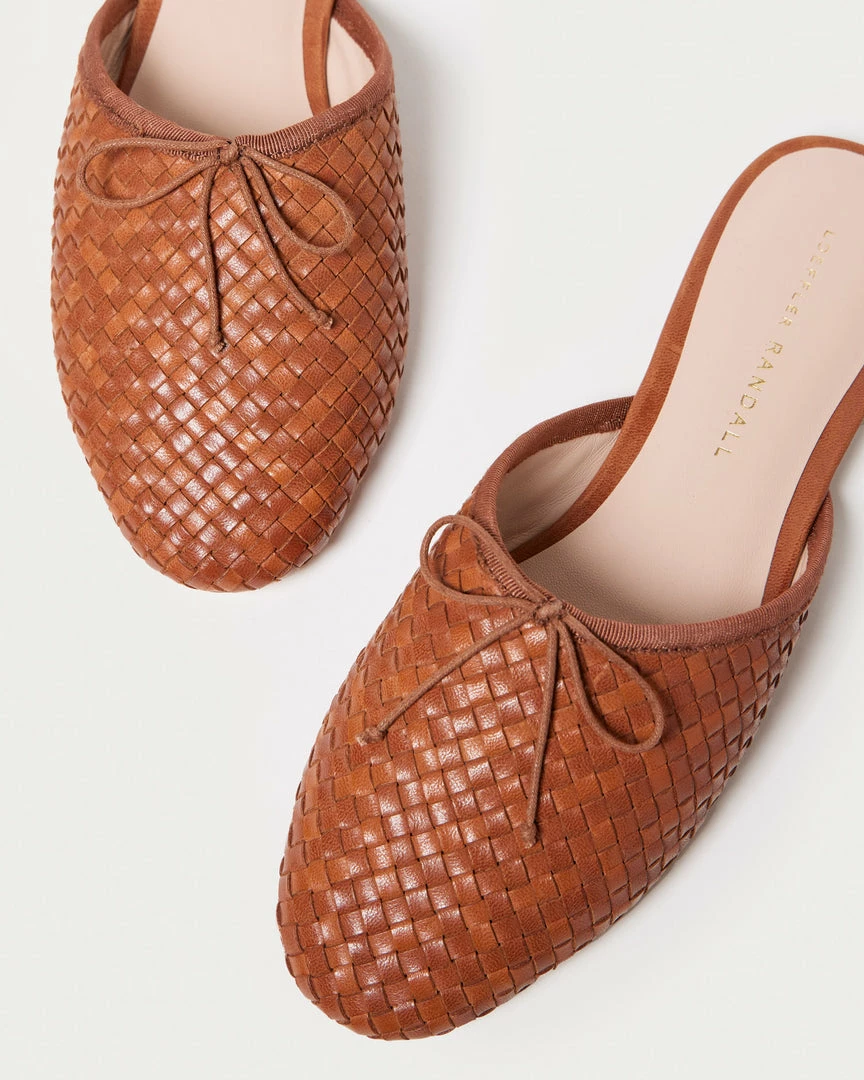 Slip-on mule ballet flat in timber brown woven leather with classic bow detail. Features a padded footbed with gold stamped logo and an almond toe.