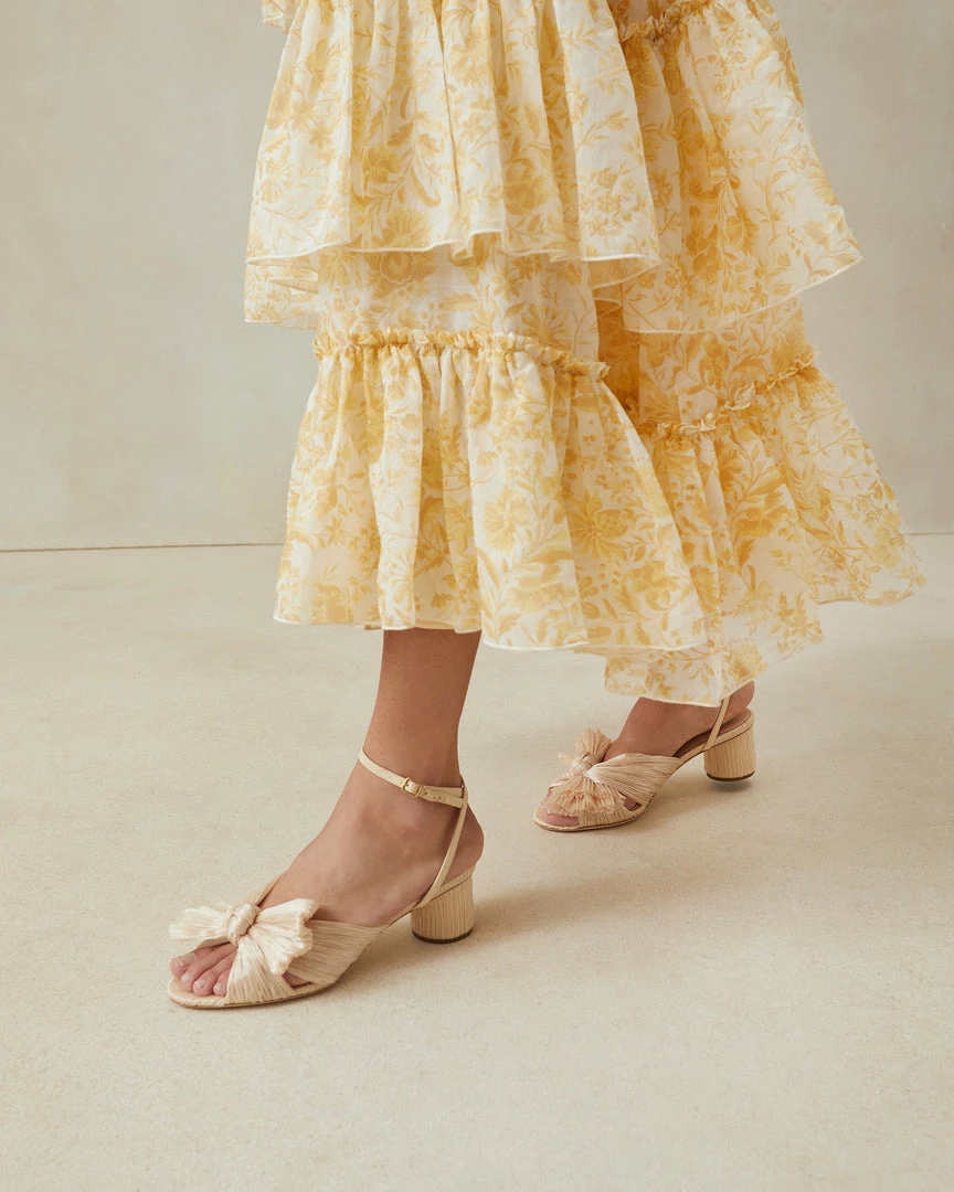 Pleated mid-heel sandal in cream fabric topped with our signature knotted bow. Features a padded footbed with gold stamped logo. Open toe with adjustable buckle ankle strap. 2 inch heel.