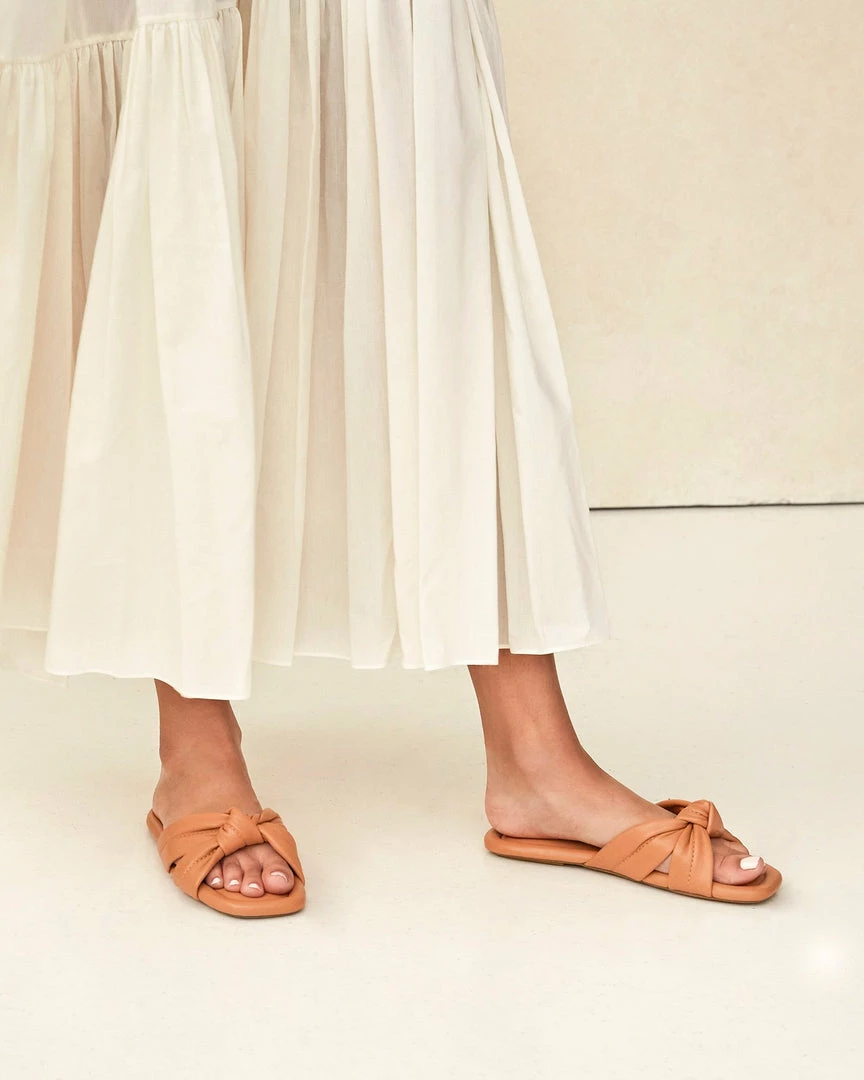 Knotted slide sandal in caramel tan glove calf leather. Puffy padded footbed with gold stamped logo.