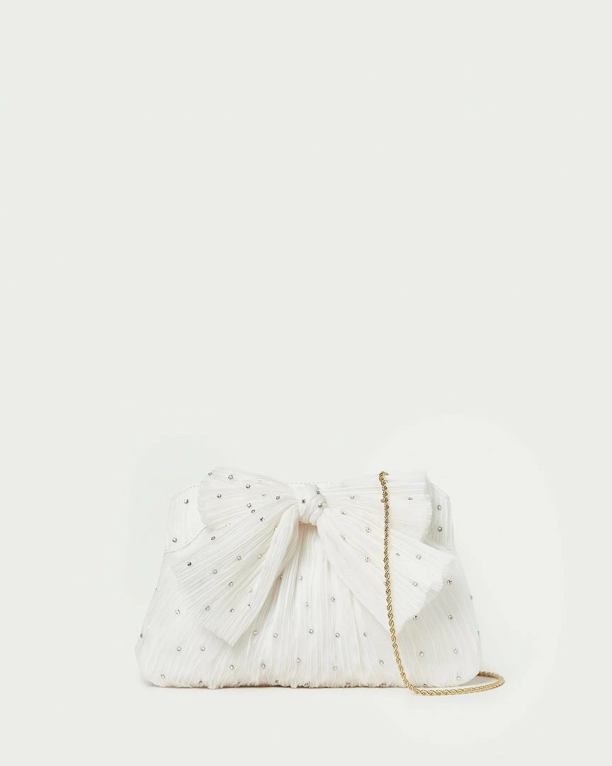 Pleated frame clutch in pearl white fabric, embellished with rhinestones and topped with our signature knotted bow. Features a removable twisted gold chain crossbody strap, frame closure, full lining, and gold stamped logo.