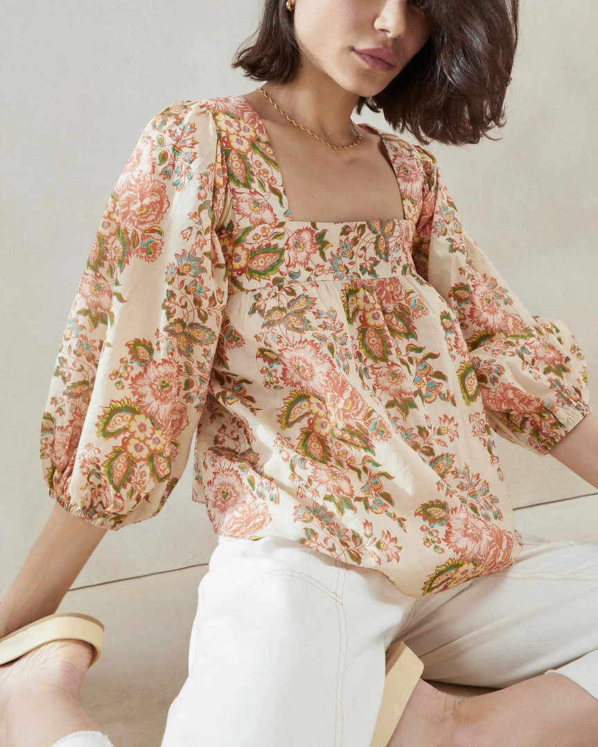 Peasant blouse in multi wallpaper floral cotton voile. Features a square neck.