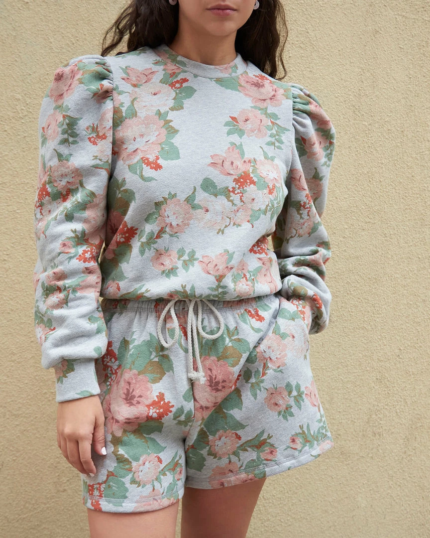 Puff-sleeved sweatshirt in a heathered grey floral-printed cotton.