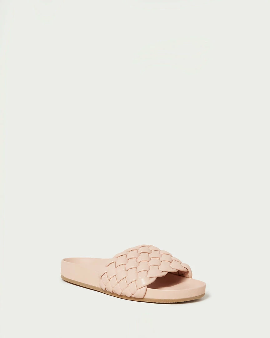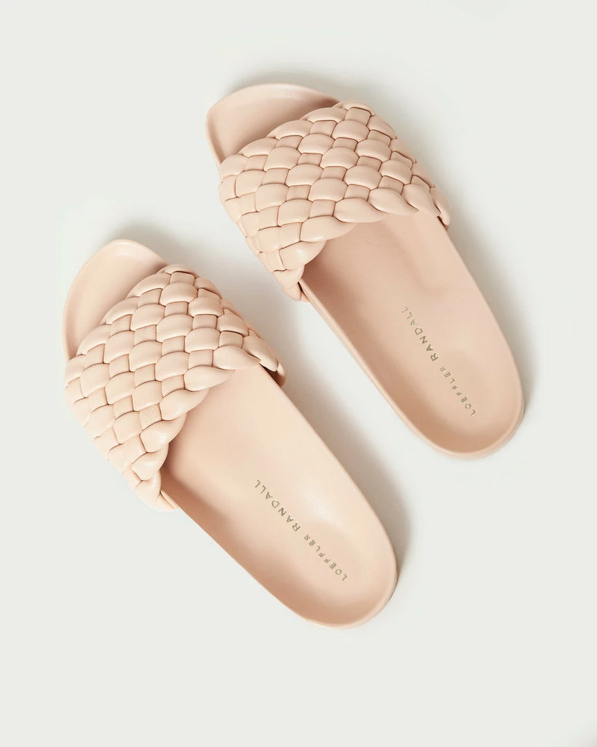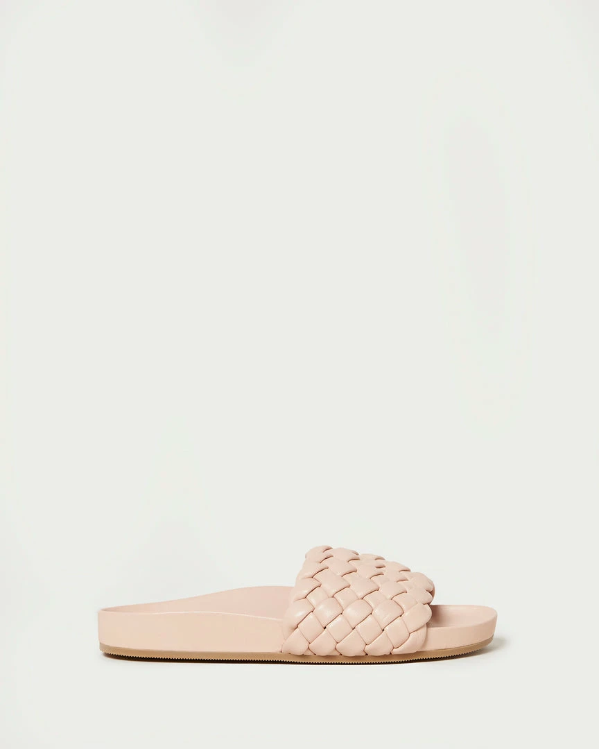 Puffy flat slide sandal in buttery ballet pink woven leather. Features a padded leather footbed, gold stamped logo, open toe, and slip-on design.