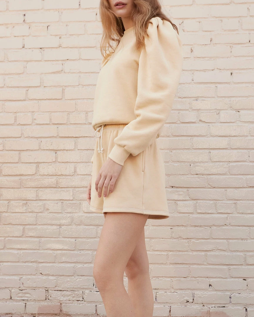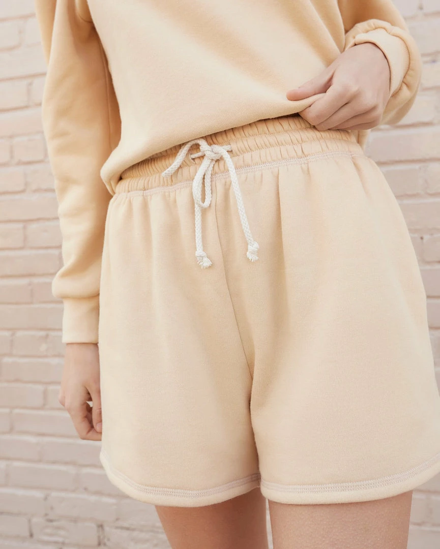 Drawstring sweat shorts in sand tan cotton. Loose, longer fit and cotton corded drawstring.