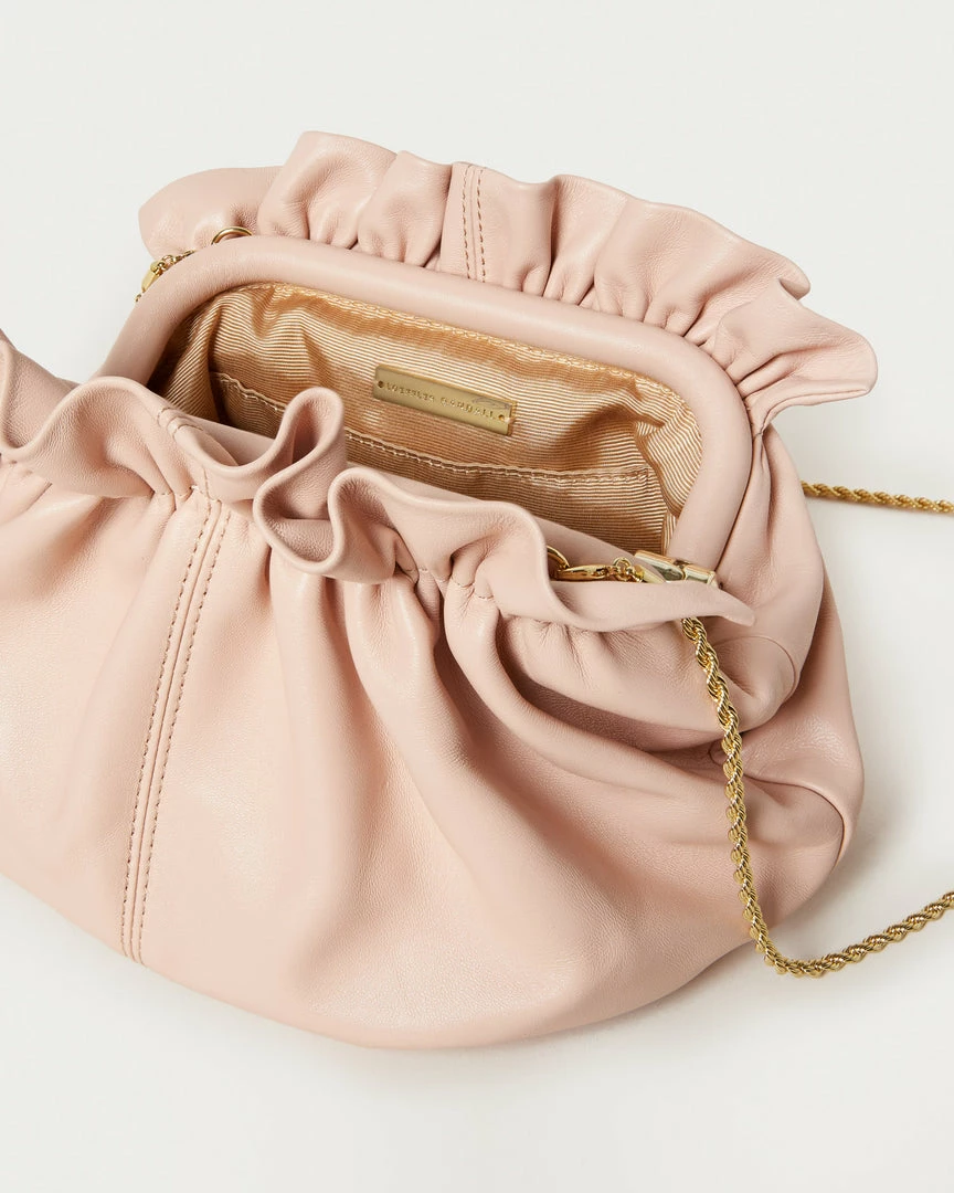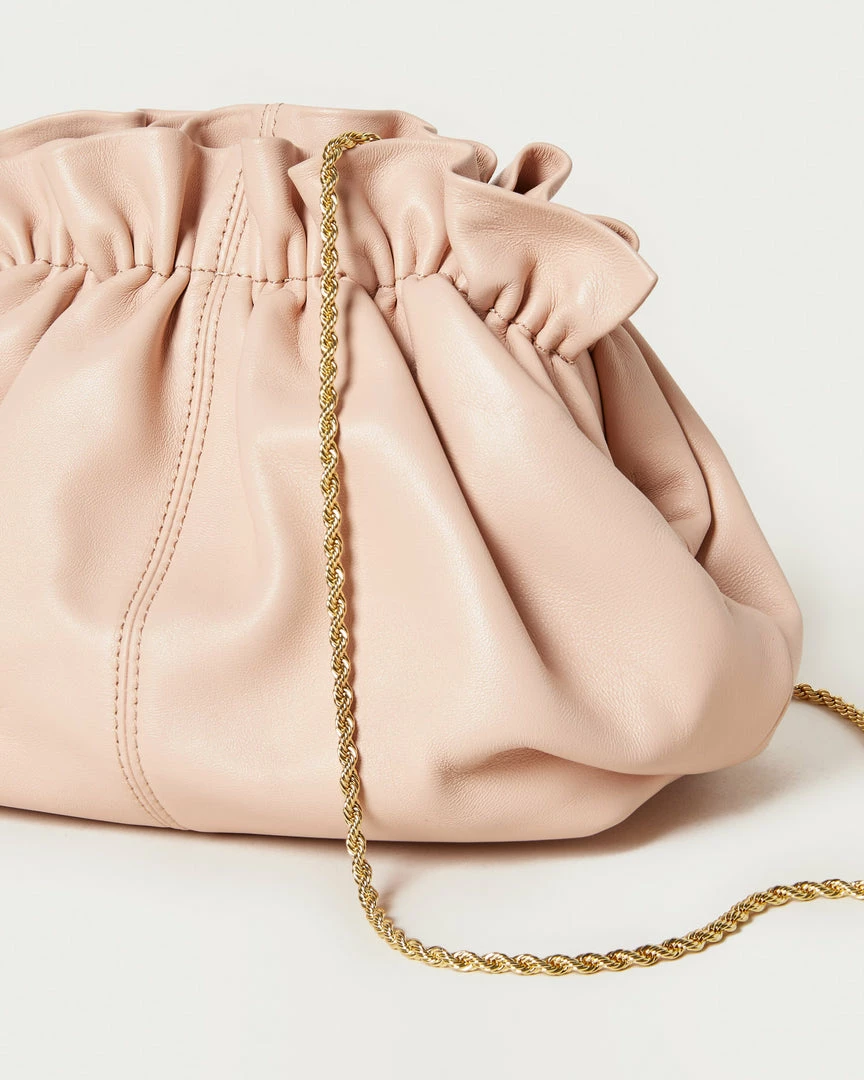 Gathered mini frame clutch in ballet pink nappa leather. Features a removable twisted gold chain crossbody strap, frame closure, and full lining.