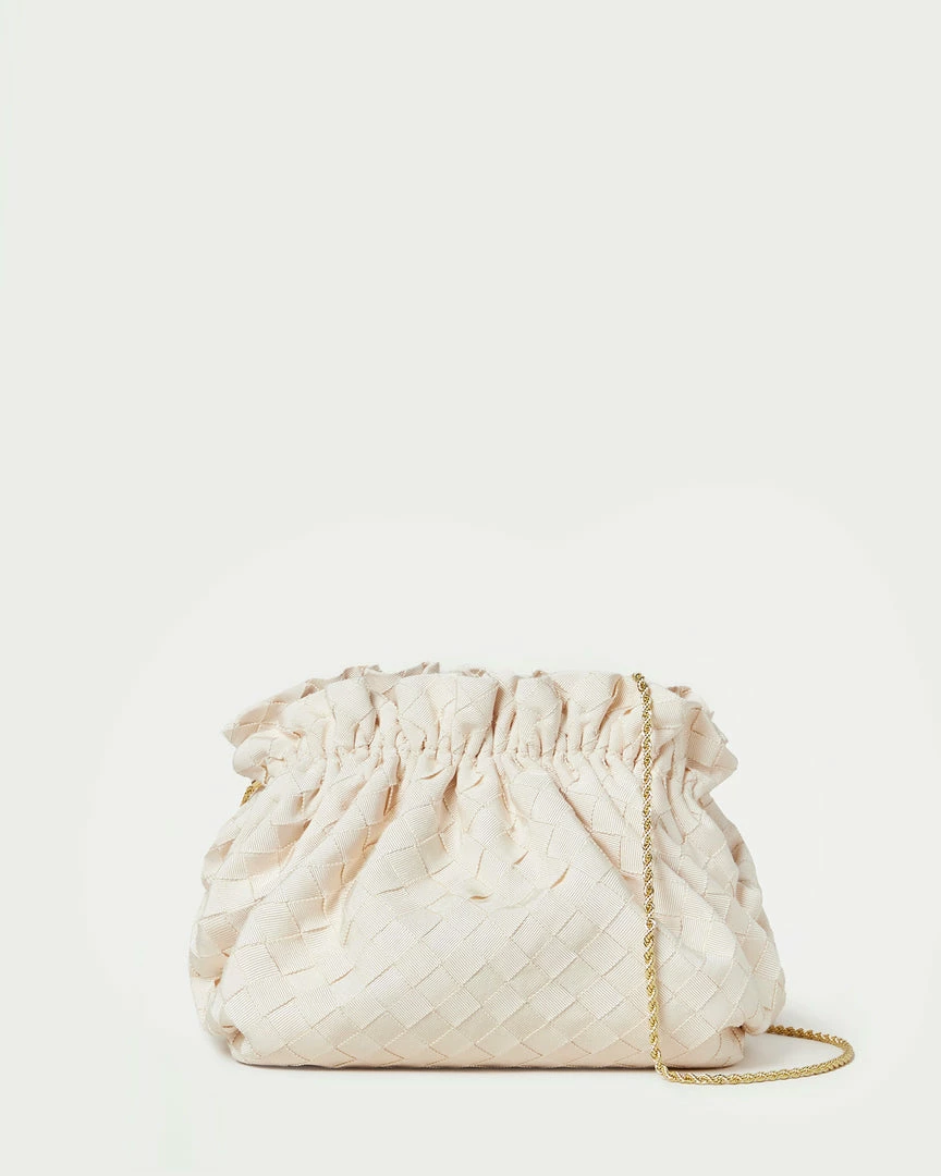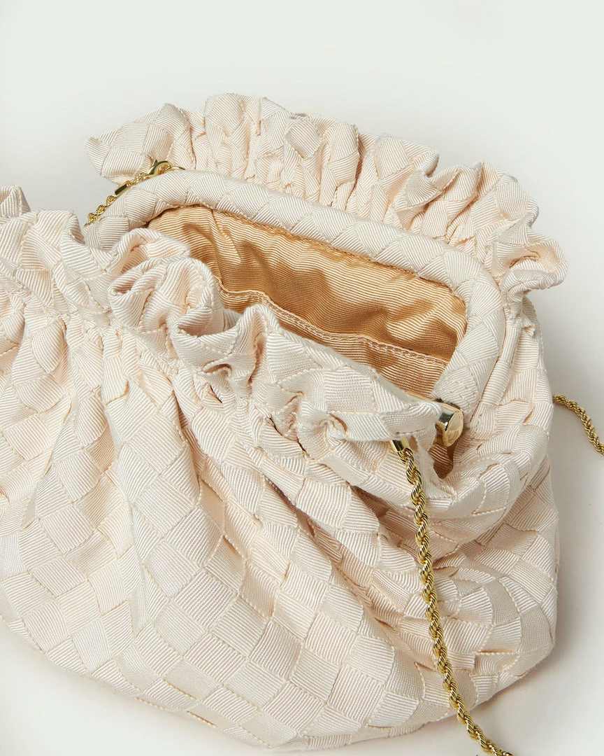 Gathered mini frame clutch in cream woven grosgrain ribbon. Features a removable twisted gold chain crossbody strap, frame closure, and full lining.